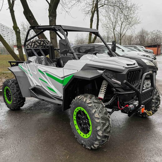 Двухместный баггиГотовы покорять бездорожье с комфортом? Наш двухместный багги – это идеальный спутник для охоты, рыбалки, экспедиций и экстремальных приключений. С мощным V-образным двигателем (799 см³, 59 л.с.) и жидкостным охлаждением он легко справляется с грязью, песком и снегом, работая на доступном АИ-92.Превосходная проходимость обеспечивается вариаторной трансмиссией с возможностью переключения между 2WD и 4WD, а также передним дифференциалом для лучшего сцепления. Независимая подвеска с двойными А-образными рычагами и ходом 110 мм (спереди) / 95 мм (сзади) гарантирует плавность хода даже на сложном рельефе. Опционально доступны азотные амортизаторы для еще большей выносливости.26-дюймовые шины (26x8 R14) с легкосплавными дисками и гидравлическими тормозами обеспечивают уверенное движение и мгновенную остановку. Клиренс 29 см позволяет преодолевать серьезные препятствия, а электрическая лебедка на 1600 кг выручит в самых сложных ситуациях.Комфорт и управляемость:Электроусилитель руля (EPS) – легкое и точное управление.