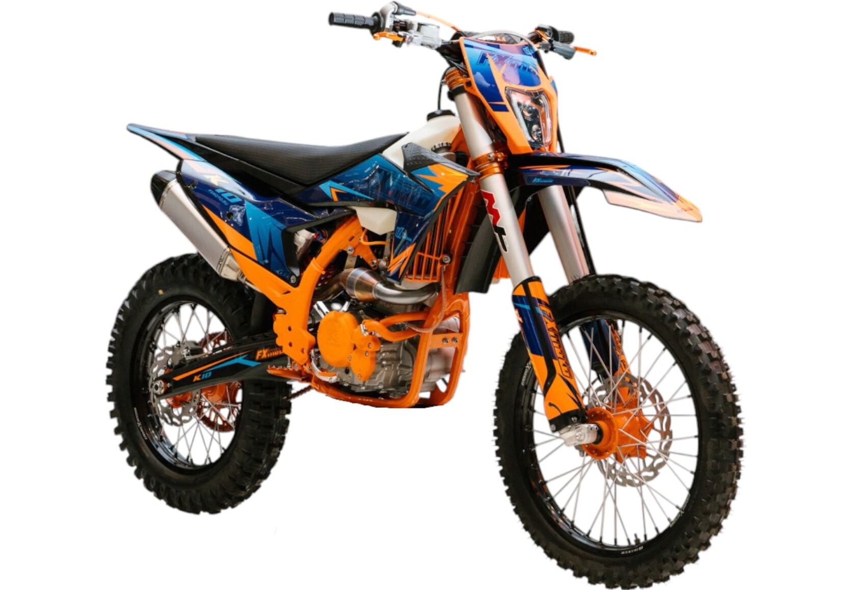 Мотоцикл FXmoto K10 (NB300) — это стильный, мощный и надежный внедорожный мотоцикл, разработанный для любителей экстремальной езды и покорения сложных трасс. Он сочетает в себе современный дизайн, высокую производительность и прочную конструкцию, что делает его идеальным выбором для тех, кто ценит адреналин и свободу передвижения по бездорожью. FXmoto K10 подходит как для активного отдыха, так и для участия в мотокроссах.Основные характеристики:Двигатель: 4-тактный одноцилиндровый двигатель объемом 300 куб. см с воздушным охлаждением. Этот мотор обеспечивает высокую мощность и крутящий момент, что позволяет легко преодолевать сложные участки дороги, подъемы и бездорожье.Трансмиссия: 5-ступенчатая механическая коробка передач, которая обеспечивает плавное переключение и полный контроль над мотоциклом в любых условиях.Подвеска: Длинноходная передняя вилка и задний моноамортизатор обеспечивают комфорт и устойчивость на неровных поверхностях, эффективно поглощая удары и вибрации.Тормоза: Дисковые тормоза на обоих колесах гарантируют надежное и эффективное торможение даже на высоких скоростях или в сложных условиях.Колеса: Прочные спицованные колеса с внедорожными покрышками обеспечивают отличное сцепление с грунтом, песком, грязью и другими типами поверхностей.Дизайн: Агрессивный и современный внешний вид с защитными элементами, такими как дуги, пластиковые крылья и прочная рама, подчеркивает спортивный характер мотоцикла.Вес: Легкая конструкция (около 120-130 кг) делает мотоцикл маневренным и простым в управлении.Идеален для езды по бездорожью, лесам, горам и другим сложным ландшафтам.Простота в обслуживании благодаря надежной конструкции и доступным запчастям.Высокая мощность двигателя позволяет легко преодолевать сложные участки дороги.Универсальность: подходит как для активного отдыха, так и для тренировок или соревнований