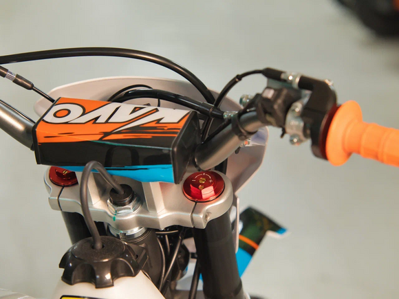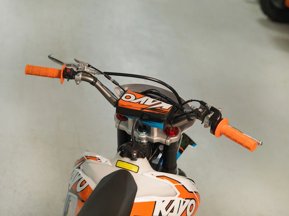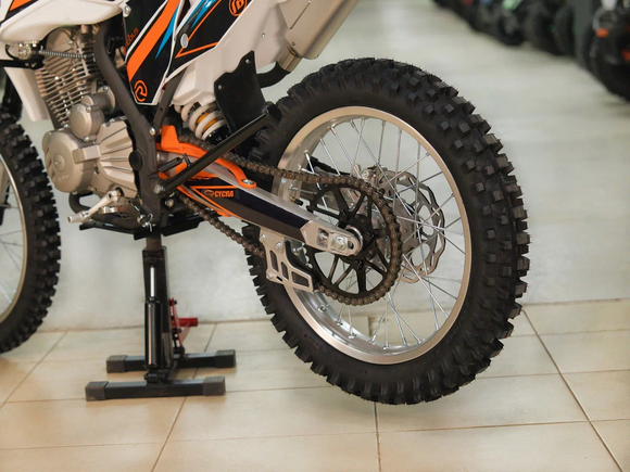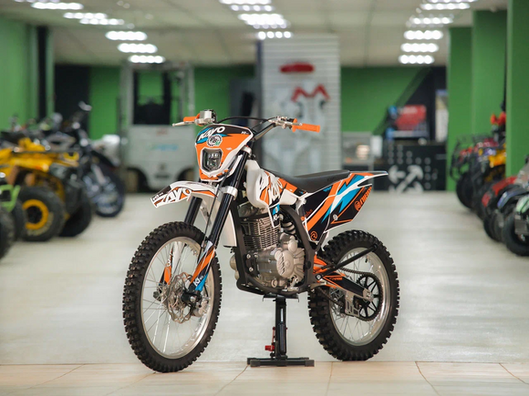 Кроссовый мотоцикл KAYO K1 250 MX – “народная” версия внедорожного мотоцикла от компании KAYO. Идеальный снаряд для внедорожного экстрима, представляющий собой оптимальный баланс производительности и технической оснащённости, поэтому он идеально подходит как новичкам, так и опытным райдерам. Удобный, простой и надёжный мотоцикл, который полностью оправдывает свою цену.Мотоцикл оснащён одноцилиндровым 4-тактным двигателем воздушного охлаждения (ZONGSHEN ZS172FMM) объёмом 249 см3, который обеспечивает высокую мощность (21 л.с.) и крутящий момент, что позволяет развивать большую скорость и с лёгкостью преодолевать трассы со сложным рельефом. Карбюраторная система подачи топлива с карбюратором NIBBI PE30 обеспечивает бесперебойную работу техники в самых жёстких условиях эксплуатации, простоту и лёгкость в обслуживании, а также неприхотливость к качеству топлива. Аппарат оснащён 5-ступенчатой механической коробкой передач с классической схемой “1-N-2-3-4-5”.Усиленная рама из хром-молибденового сплава и подвеска позволяют эффективно амортизировать удары при езде по неровностям и препятствиям на трассе. Передняя подвеска телескопическая вилка перевёрнутого типа от фирмы KKE длиной 800 мм, задняя — нерегулируемый моноамортизатор 360 мм, рассчитанный на высокие нагрузки до 900 LBS, также произведённый компанией KKE. Мотоцикл оснащён классическими спицованными колёсами диаметром 18 и 21 дюйм. Колёса имеют усиленные обода из алюминиевого сплава и буксаторы. Эффективное и безопасное замедление с любых скоростей обеспечивают гидравлические дисковые тормоза.Мотоцикл достаточно компактен и имеет вес всего в 105 кг, поэтому он комфортен в эксплуатации одновременно и для мужчин среднего телосложения, и для девушек. Аппарат оснащён системой запуска двигателя при помощи кнопки электростартера или при помощи рычага кик-стартера.Высококачественная износостойкая резина с развитым протектором отлично держит дорогу на различных типах покрытия и в самых разных поворотах. Сиденье эргономичной формы покрыто антискользящим материалом.K1 250 MX сочетает в себе отличные технические характеристики, комфорт и надёжность, что позволяет вам ощутить настоящую свободу на любой трассе