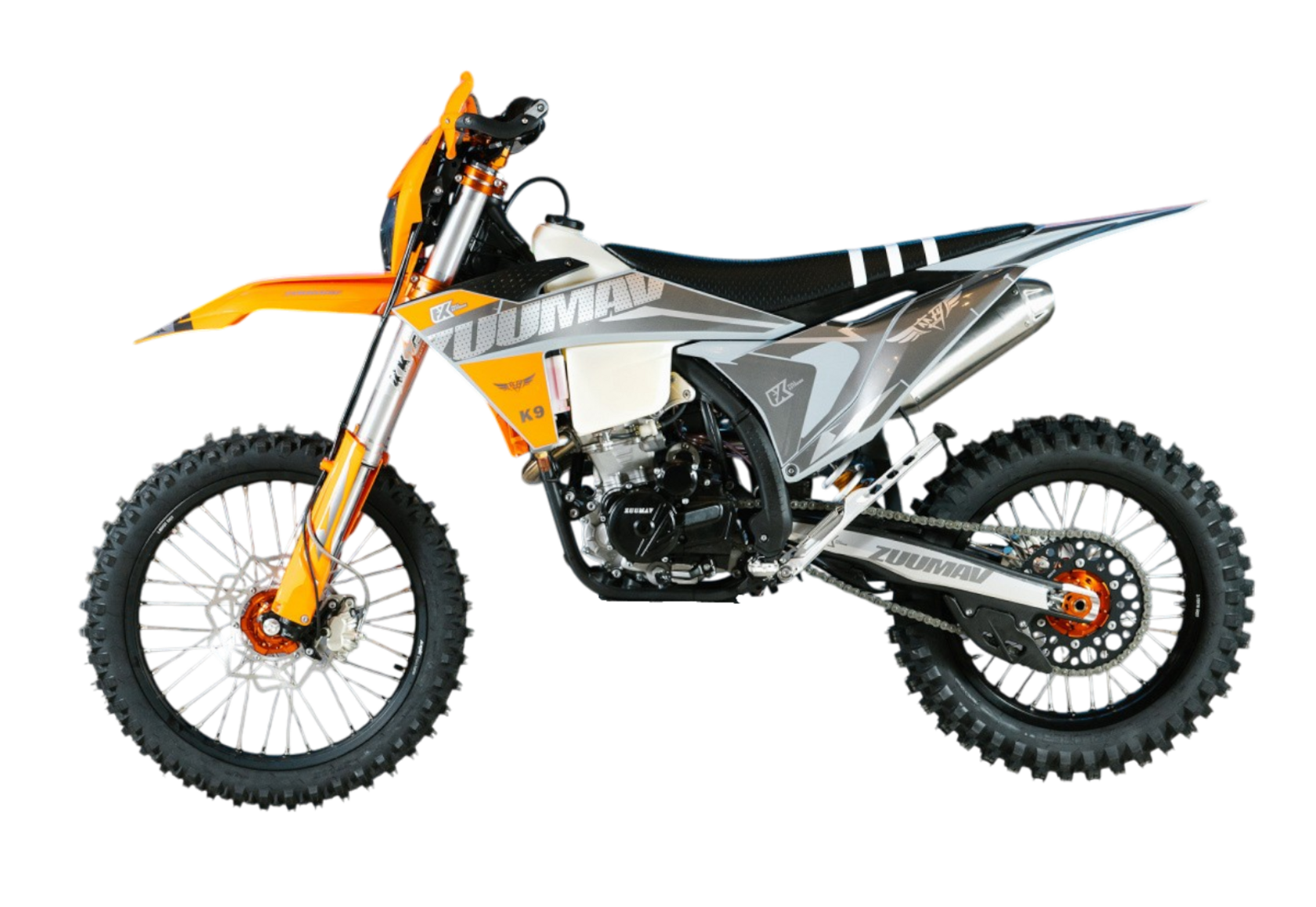 Мотоцикл Zuumav K9 (YBS-300) — это высокопроизводительный эндуро-кроссовый байк, предназначенный для преодоления сложных бездорожных маршрутов. Он оснащен 4-тактным двигателем Loncin YBS300 объемом 292,4 куб. см, развивающим мощность 34 л.с. при 9000 об/мин и крутящий момент 27 Н·м при 8500 об/мин. Система охлаждения жидкостная, а запуск осуществляется с помощью электростартера.Мотоцикл оборудован 6-ступенчатой механической коробкой передач и цепным приводом. Передняя подвеска представляет собой телескопическую вилку перевернутого типа диаметром 48 мм с ходом 270 мм и возможностью регулировки отбоя, сжатия и спуска избыточного давления. Задняя подвеска включает алюминиевый фрезерованный маятник с газомасляным моноамортизатором, обеспечивающим ход 260 мм и регулировку предварительного натяжения, отбоя и сжатия.Тормозная система состоит из переднего дискового тормоза с двухпоршневым суппортом и заднего дискового тормоза с однопоршневым суппортом, оба диаметром 240 мм. Колеса оснащены алюминиевыми дисками с шинами размером 80/100-21 спереди и 120/80-18 сзади. Топливный бак объемом 9,5 литров обеспечивает длительные поездки без частых заправок. Сухой вес мотоцикла составляет 120 кг, а максимальная скорость достигает 120 км/ч.Дополнительные особенности включают резонатор выхлопной системы Megabomb, алюминиевый фрезерованный маятник и стальную защиту двигателя толщиной 3 мм, что повышает надежность и долговечность мотоцикла.Zuumav K9 (YBS-300) — идеальный выбор для энтузиастов бездорожья, ищущих мощный и надежный мотоцикл для экстремальных приключений.