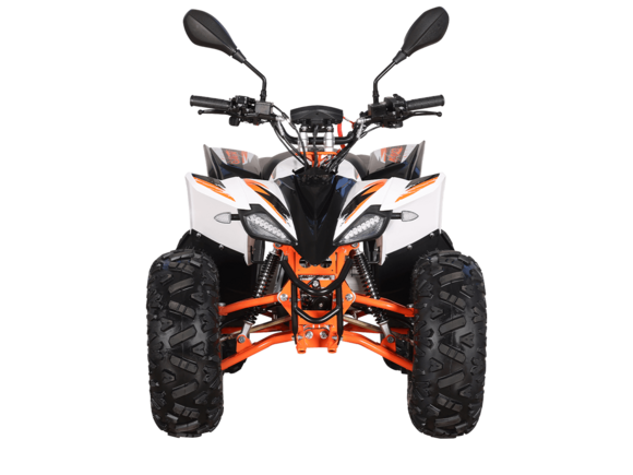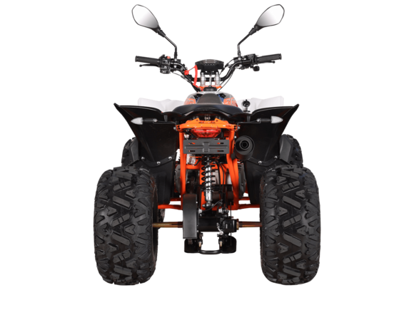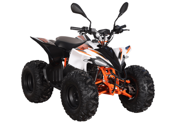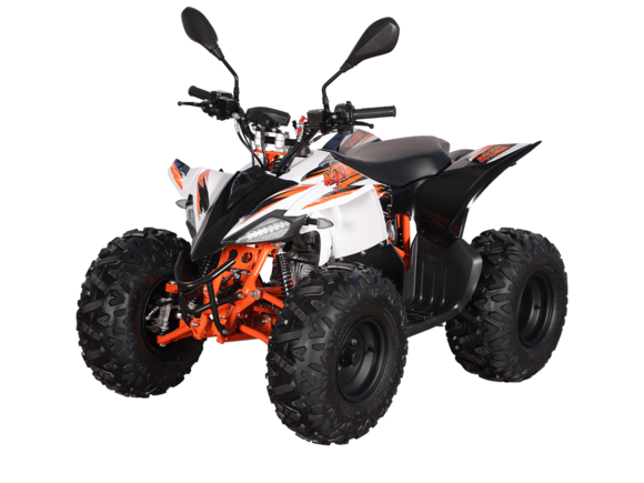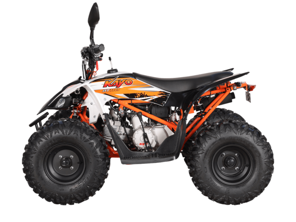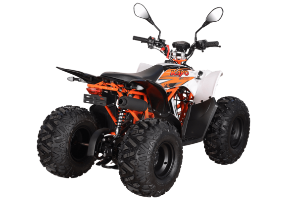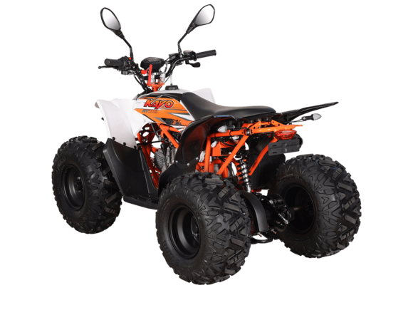 Квадрицикл KAYO AT110 – выносливая модель для освоения спортивной езды по бездорожью или помощи в хозяйстве. Хорошо подходит для детей и подростков, интересующихся поездками за пределами проторенных троп.Одноцилиндровый 4-тактный двигатель YX1P53FMH-2 с верхним распредвалом и воздушным охлаждением имеет объём 107 см3. Максимальная мощность 7,2 л.с. За подачу топлива отвечает карбюратор. Привод осуществляется на 2 колеса. Трансмиссия имеет автоматическую коробку передач со схемой F-N-R.Запуск осуществляется с помощью системы электронного зажигания. Имеется функция родительского дистанционного выключения двигателя.На квадрицикле используются колёса диаметром 8 дюймов. Амортизаторы подвески имеют длину 265 мм, задние можно регулировать. За торможение отвечает гидравлическая дисковая система. Клиренс составляет 110 мм, колёсная база 920 мм.Габариты модели 1360х840х880 мм, высота по седлу 660 мм, вес 98 кг. Ёмкость бака 4 литра.Наличие ПТС позволяет зарегистрировать технику на дорогах общего пользования.