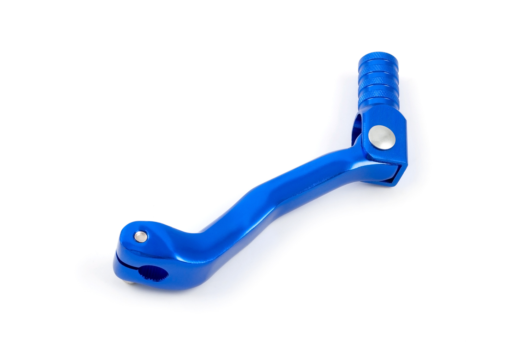 Алюминиевый складной рычаг переключения передач синего цвета для эндуро мотоциклов с двигателями 165-172 FMM и 174 CBS-NB. Изготовлен из литого алюминия со складным кончиком, который предотвращает поломку рычага при падении или боковом ударе. Универсальная конструкция с вылетом, не гнет вал при падениях. Установка без втулки. Совместим с двигателями 165FMM, ZS170MM-2, ZS172-3A, ZS172-5A, ZS174MN-3.