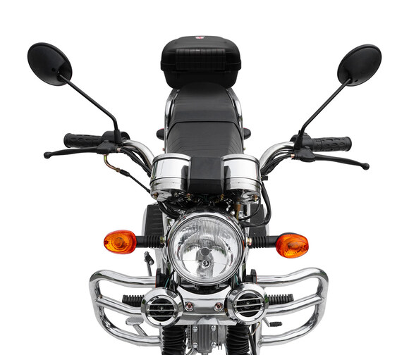 Комплектация Тормозная система – два барабанных тормоза. Усиленные тросы переднего тормоза и сцепления. Кроме того, на Regulmoto Alpha (RM-1) установлены зеркала заднего вида, подножки для пассажира, багажный кофр, кожух защиты цепи и дуги безопасности.
