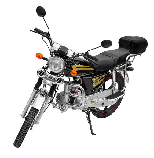 Regulmoto Alpha (RM-1) 110сс – «живая классика» китайской мотоиндустрии, один из самых доступных представителей двухколесного транспорта утилитарного назначения. Новое поколение Alpha готово продемонстрировать улучшенные показатели производительности, высокую надежность в повседневной эксплуатации и традиционную неприхотливость в сервисном обслуживании. Данный мопед комплектуется надежным «кабовским» двигателем – одноцилиндровым 4-тактником воздушного охлаждения с 4-ступенчатой трансмиссией. Рабочий объем мотора увеличен до 110 см3 благодаря установке нового комплекта ЦПГ на заводе-изготовителе. Запуск двигателя возможно осуществить как при помощи кнопки электрострартера, так и при помощи рычага традиционного кик-стартера. Увеличение рабочего объема мотора заметно сказывается как на максимальной развиваемой мощности, которая составляет чуть больше семи лошадиных сил, так и на эксплуатационных характеристиках техники.Среди других усовершенствований комплектации обновленного Regulmoto Alpha (RM-1) следует отметить более мощные передние амортизаторы (диаметр до 28 миллиметров), усиленные тросы переднего тормоза и сцепления, современную светодиодную лампу в фаре головного света. Кроме того, на Regulmoto Alpha (RM-1) установлен полный комплект светотехники, зеркала заднего вида, аналоговая приборная панель, на которой отображаются пробег, скорость, выбранная передача, обороты двигателя, индикаторы работы поворотников и фары. Также имеются подножки для пассажира, багажный кофр, кожух защиты цепи и дуги безопасности.Владелец новенького Regulmoto Alpha (RM-1) по достоинству оценит экономичный двигатель, высокую надежность конструктивных решений и доступную стоимость сервисного обслуживания техники. Мопед полностью готов к комфортному использованию на дорогах города и проселках пригорода и способен успешно справляться с широким кругом эксплуатационных задач.