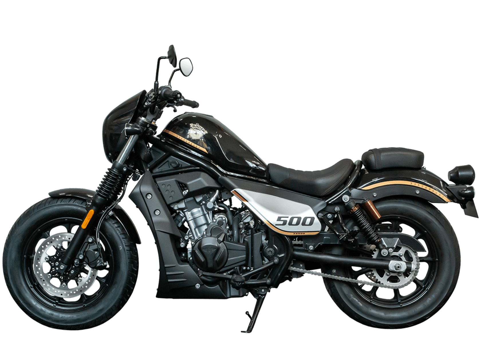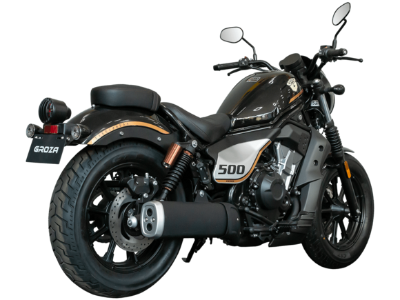 GROZA XS500 – великолепный лёгкий круизёр, идеальный как для езды по мегаполису, так и для поездок по загородным дорогам.Рядный двухцилиндровый четырёхтактный мотор объёмом 471 см3 выдаёт внушительные 48 л.с. и при высоких показателях динамики и отличном крутящем моменте способен разгонять аппарат до 160 км/ч. Инжекторный впрыск топлива с инжектором DELPHI увеличивает топливную экономичность, а также позволяет добиться высокой приёмистости и неприхотливости агрегата. Привод на ведущее колесо осуществляется ремнём знаменитой марки USA Gates. Жидкостная система охлаждения не допустит перегрева мотора даже при самом агрессивном вождении.На аппарат установлена 6-ступенчатая механическая коробка передач с классической схемой “1-N-2-3-4-5-6”. Мотоцикл оснащён литыми алюминиевыми дисками диаметром 16 дюймов. С неровностями дороги эффективно справляются телескопическая вилка спереди и два газонаполненных амортизатора сзади. Задние амортизаторы являются регулируемыми, что обеспечивает лёгкую перестройку на различные режимы езды. Эффективное и безопасное замедление с любых скоростей обеспечивают гидравлические дисковые тормоза с ABS спереди и сзади.Мотоцикл имеет множество привлекательных декоративных элементов в олдскул-стилистике, что делает его похожим на кастом-байк.XS500 сочетает в себе отличные технические характеристики, комфорт и надёжность, что позволяет вам ощутить настоящую свободу на любой дороге.