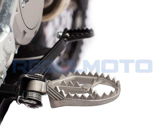 Питбайк Regulmoto SEVEN MEDALIST PRO 19/16 - популярная модель питбайка, которую отличают взвешенный подбор комплектующих и широкий эксплуатационный потенциал. Высокий по седлу питбайк подходит райдерам с ростом выше среднего, а возможности аппарата позволят его владельцу использовать технику для спортивных развлечений и совершенствования навыков управления.В стальной раме Regulmoto SEVEN MEDALIST PRO, покрытой защитным напылением Raptor и оснащенной дополнительными защитными накладками, устанавливается надежный и производительный одноцилиндровый 4-тактный мотор с электростартером, который работает в паре с карбюратором Nibbi PE19. Для передачи крутящего момента на заднее колесо питбайка задействована механическая 4-ступенчатая трансмиссия и цепная передача, где ведомая звезда и сальниковая 428-я цепь – производства бренда Choho.Подвеска обновленной модели была доработана для наилучшей производительности в различных условиях использования питбайка; используются амортизаторы KKE. Колеса собраны на усиленных алюминиевых дисках с 36-ю спицами, в стоке оснащены буксаторами и качественными внедорожными покрышками. Среди других комплектующих и компонентов. Особенности питбайка: • высокий толстостенный руль с перемычкой ProTaper EVO из алюминия с возможностью регулировки вылета;
