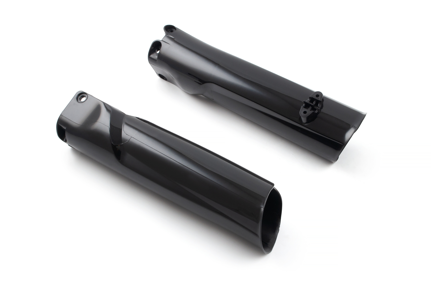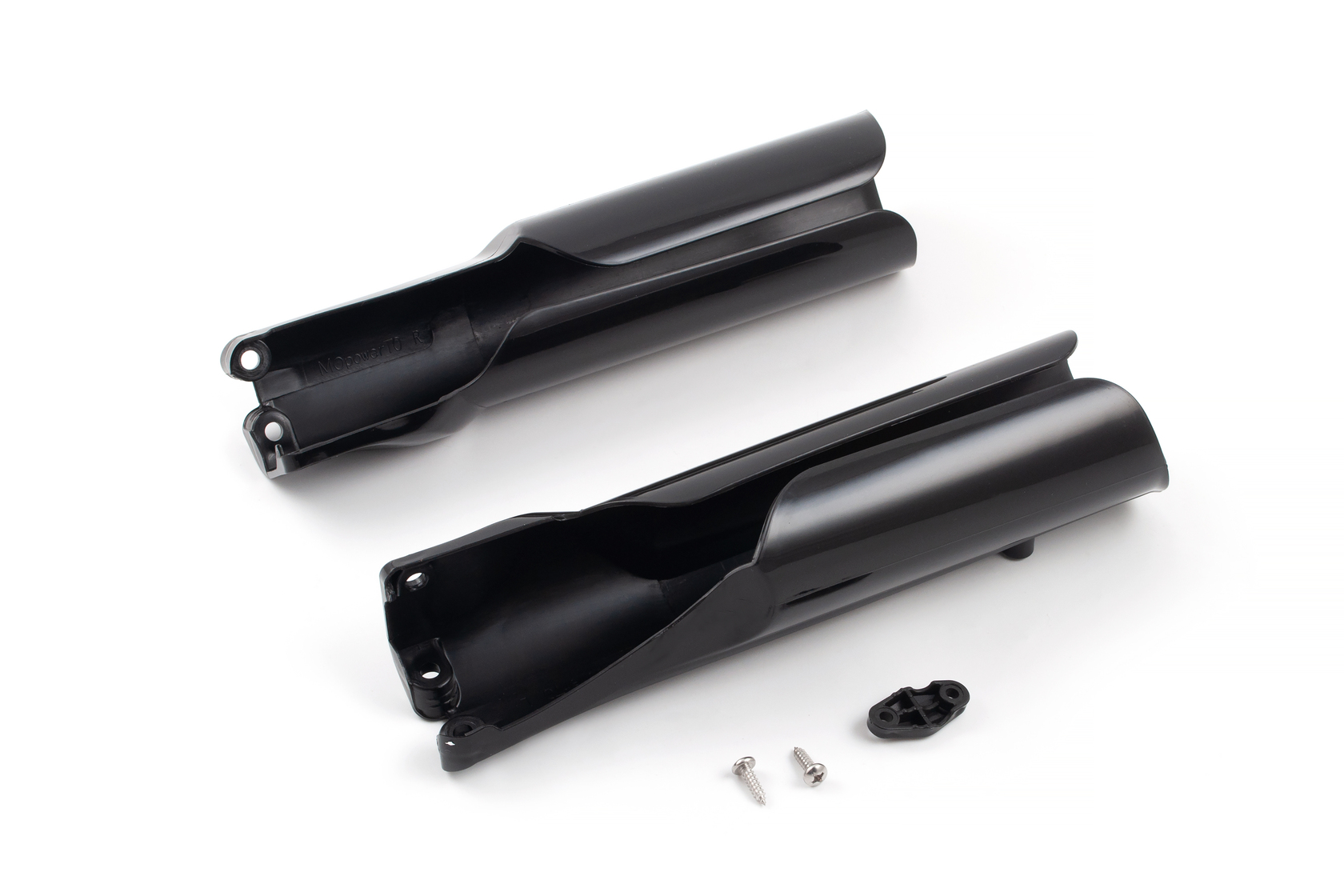 Универсальные защитные накладки на вилку черного цвета полного охвата (360). Обеспечивают максимальную защиту перьев вилки от механических повреждений, грязи, песка и абразивного износа. Изготовлены из ударопрочного пластика. Полный аналог оригинальной детали KTM с артикулом A46001094000C1. Подходят для вилок диаметром 48 мм различных производителей (HT, WP, MNT). Прямая установка без доработок.