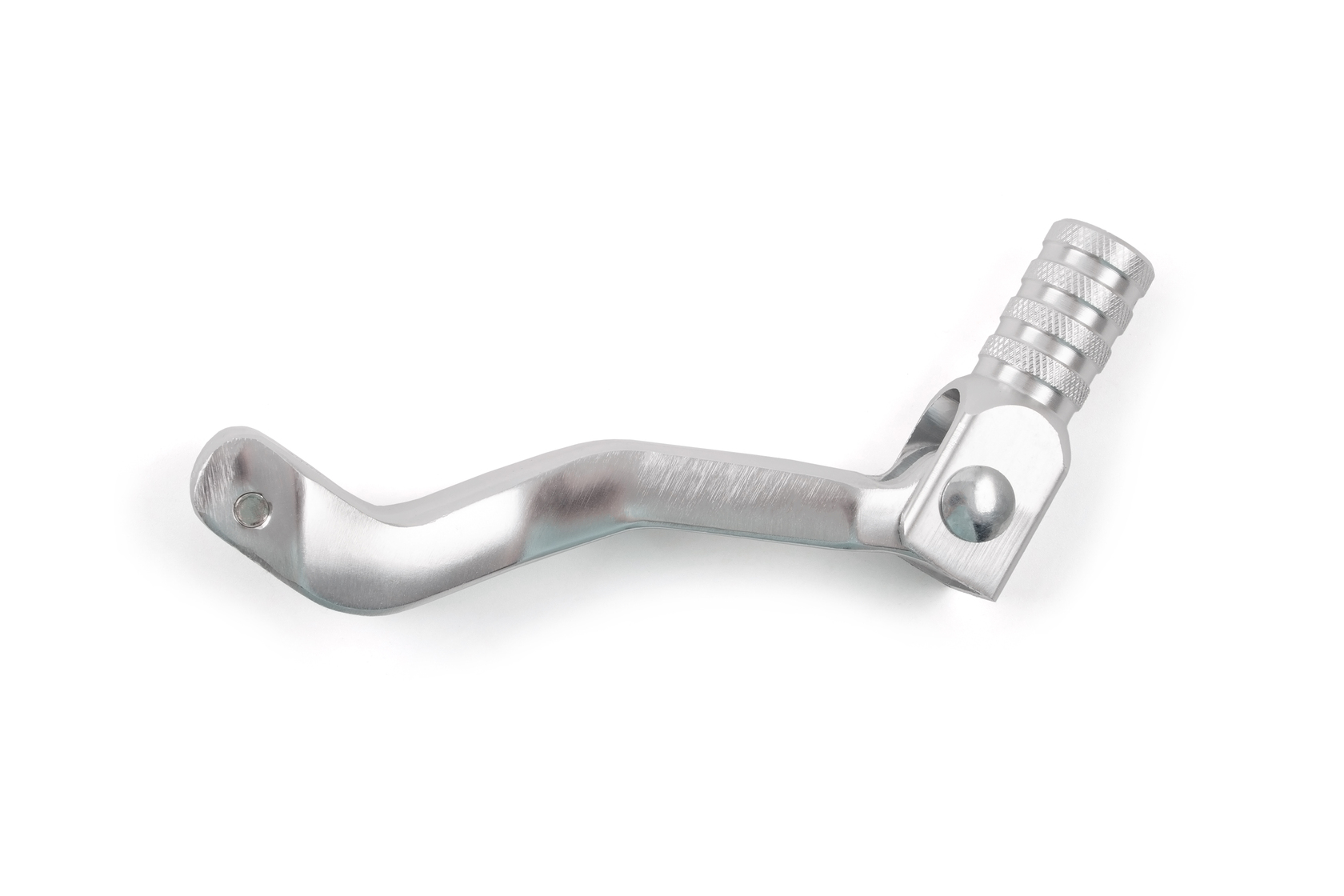 Алюминиевый складной рычаг переключения передач серебристого цвета для эндуро мотоциклов с двигателями 165-172 FMM и 174 CBS-NB. Изготовлен из литого алюминия со складным кончиком, который предотвращает поломку рычага при падении или боковом ударе. Универсальная конструкция с вылетом, не гнет вал при падениях. Установка без втулки. Совместим с двигателями 165FMM, ZS170MM-2, ZS172-3A, ZS172-5A, ZS174MN-3.