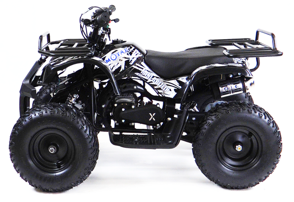 MOTAX GRIZLIK Х16 ES с электростартером и родительским пультом.Этот квадроцикл оборудован 6-дюймовыми колёсами и шинами с внедорожным протектором.Отлично подойдёт для детей от 3 до 8 лет.Квадроцикл оборудован компактным, двухтактным бензиновым двигателем объёмом 50 куб. см. в паре с фрикционным сцеплением центробежного типа. Это обеспечивает простоту и надежность конструкции. Квадроцикл имеет хорошую базовую комплектацию: он оборудован электрическим стартером, пультом дистанционного глушения и запуска двигателя, механическим ограничителем скорости, кнопкой быстрой остановки двигателя, яркими передними светодиодными фарами с режимом ближнего и дальнего света, раздвоенной системой выхлопа, механическим ручным стартером с механизмом легкого запуска. За счёт этого механизма существенно снижено усилие при запуске двигателя, с этой задачей может справиться и ребенок. Простота управления обусловлена фирменной передней подвеской полузависимого типа, которая позволяет сохранить стабильность в движении и лёгкость рулевого управления. Передние и задние механические дисковые тормоза способны эффективно остановить лёгкий и прочный квадроцикл.Детский квадроцикл оборудован передним и задним багажниками и прочным передним бампером. Эта модель отлично подойдёт как для получения первого опыта вождения, так и для активной езды по дачным дорожкам и лесопарковым зонам. Квадроцикл будет радовать ребенка круглый год! Он легко преодолевает небольшие препятствия, заезжает в горку, на бордюр. Ему не страшны лужи, грязь и песок.